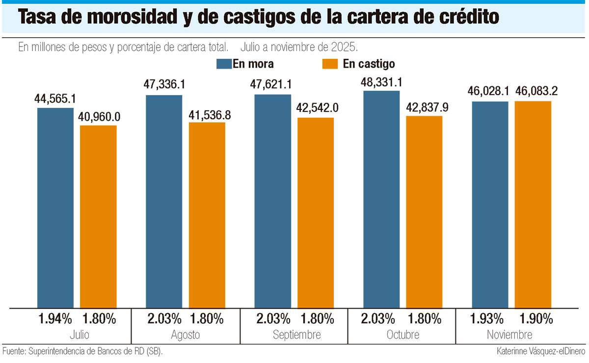 De octubre a noviembre, la cartera de créditos en mora bajó de RD$48,331 millones a RD$46,028 millones. Sin embargo, la cartera castigada, para el mismo período, aumentó de RD$42,837.9 millones a RD$46,083.2 millones.