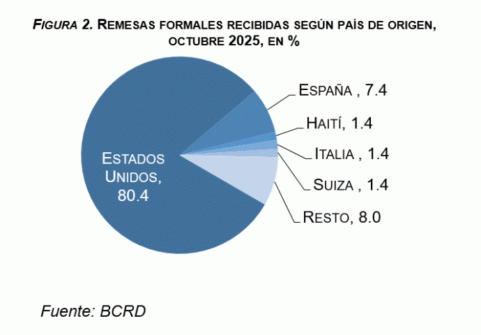 El BCRD destaca también la recepción de remesas por canales formales desde otros países en el mes de octubre, como España, por un valor de US$66.0 millones, un 7.4% del total, siendo este el segundo país en cuanto al total de residentes de la diáspora dominicana en el exterior se refiere, así como Italia, Haití y Suiza, con 1.4% de los flujos recibidos, cada uno. En el resto de la recepción de remesas se distinguen países como Canadá y Francia, entre otros.