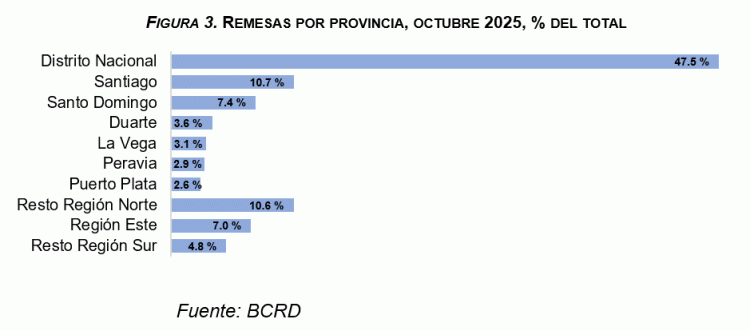 Respecto a la distribución de las remesas recibidas por provincias, el BCRD señala que el Distrito Nacional recibió una proporción del 47.5% durante octubre, seguido por las provincias de Santiago y Santo Domingo, con un 10.7% y 7.4%, respectivamente. Esto indica que cerca de dos terceras partes de las remesas (65,6 %) se recibe en las zonas metropolitanas del país.