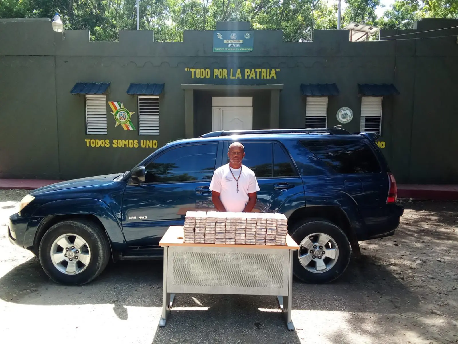 Agentes policiales identificaron al detenido como Enrique Fernando Jáquez Encarnación, quien figuraba como Cabo (r) de la Policía Nacional. Lo arrestaron mientras conducía una jeepeta Toyota 4Runner azul, con placa haitiana No. BB22471.